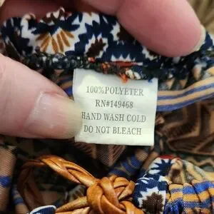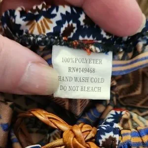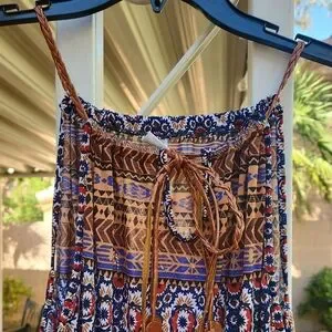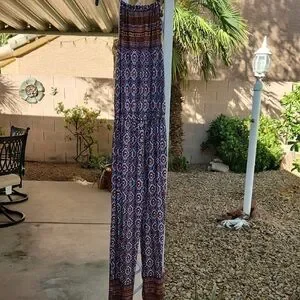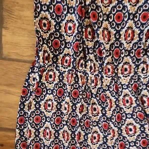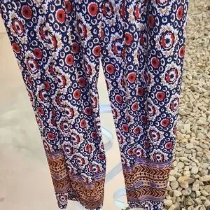 Lightweight women's jumpsuit with a relaxed wide-leg silhouette. Boho geometric print in blue, white and rust tones. Elasticized smocked bodice with adjustable tie for a comfortable fit. Soft, breathable fabric perfect for casual outings and warm-weather wear. Very good pre-owned condition. Pit to pit measures about 20"
