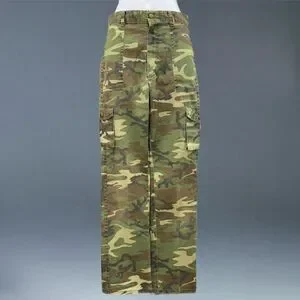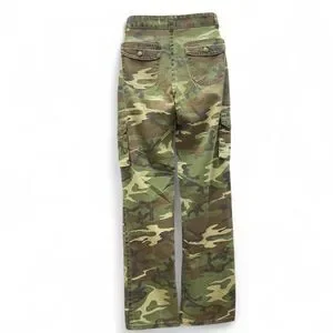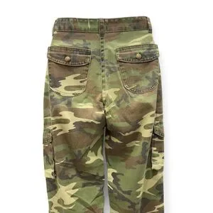 Classic straight leg cargo pants in camouflage print. Front button and zip closure. Multiple cargo pockets for storage. Durable cotton-blend fabric. Versatile military-inspired style.