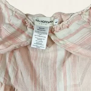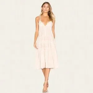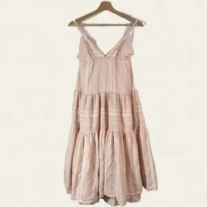 Soft, feminine, and sustainably made, this Mara Hoffman midi dress is an effortless warm-weather staple. Crafted from organic cotton, it features a delicate blush and cream stripe pattern with a lightweight, airy feel. Designed with slender spaghetti straps, a flattering V-neckline, and a softly gathered empire waist that flows into a tiered skirt for easy movement and comfort.