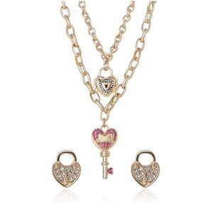 Charming Juicy Couture necklace with heart key pendant. Features pink and gold accents. Includes matching heart earrings.