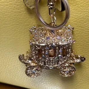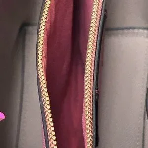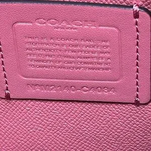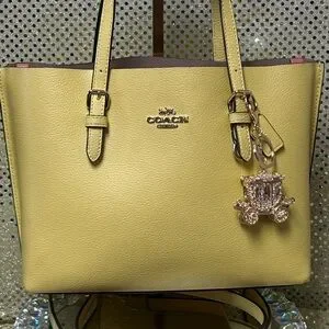 Structured leather tote with polished gold-tone Coach logo. Adjustable top straps for easy carry. Decorative jeweled charm adds sparkle. Sleek, roomy silhouette for daily use. Crossbody strap drop is approx. 45” long. All metal is goldtone. Carrying double straps have an approx. 5” drop. The interior has a dusty rose colored zipper compartment. Unbranded dustbag and Bag charm included.