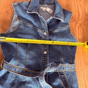 Sleeveless denim dress with a collar. Front button closure and stitched seam details. Self-tie waist belt. Classic blue denim look.