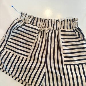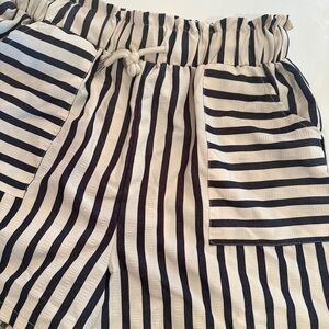 High-waist shorts with elastic waistband and front drawstring. Features roomy patch pockets. Vertical black and white stripe design. Lightweight and casual for warm days.