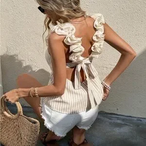 Classic Ruffle Back Striped Print Peplum Top Blouse Shirt