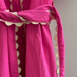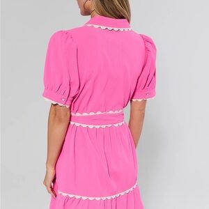 A charming pink mini dress with scallop trim and a flattering tie-waist. Short puff sleeves and button-front styling create a polished, feminine look. Lightweight fabric offers comfortable all-day wear. Perfect for daytime events and casual outings.