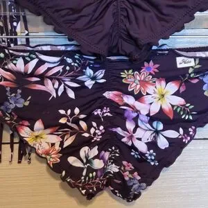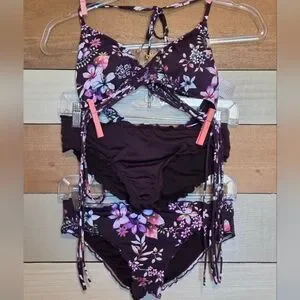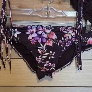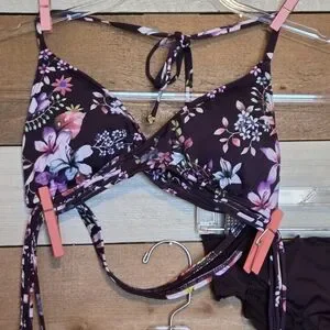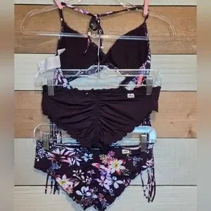 Super Cute Hobie 3 piece Bikini Set with Strappy wrap around Top (see last 2 photos for fit) and cheeky bottoms! Top is size Large/Both bottoms size Small (missing size tags), in good condition! Please see all photos for condition and best description!