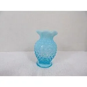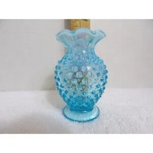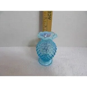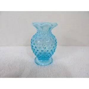 Enhance your collection with this stunning Fenton Hobnail Aqua Blue Opalescent Glass Bud Vases with a charming ruffle edge. This original piece is made of high-quality glass and features a colonial style that is perfect for adding elegance to any space. The vases have been well-maintained, making it an ideal addition to your decorative collectibles.