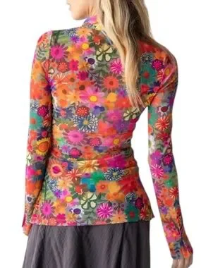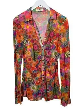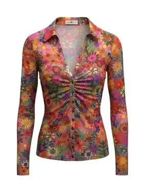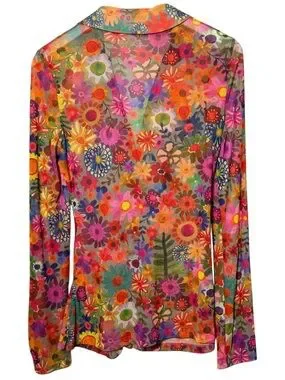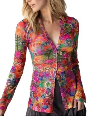 Bright floral sheer button-down top with button cuff details. Features vibrant mix of colors.
