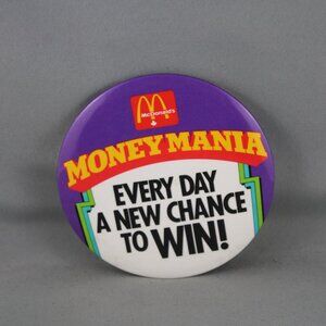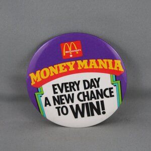 Up for sale is a vintage McDonald's pin. It has a purple base colour with Money Mania a new chance to win everyday screneed on. What a great pin do not miss out on it.