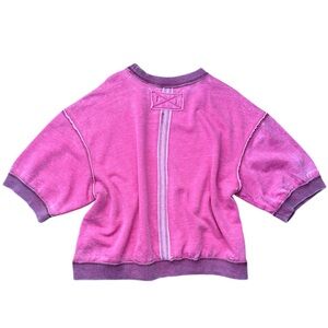 Soft boxy sweatshirt with dropped shoulders. Washed pink fabric and contrast ribbed trim. Short puff sleeves with raw seam details. Lightweight cozy feel. Easy to layer and casual to wear.