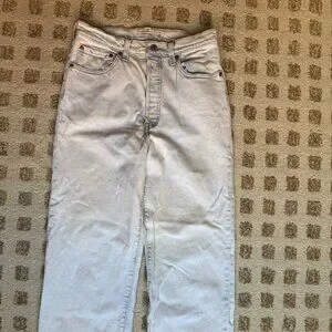 High-rise Levi’s Ribcage Jeans, light wash. 100% cotton. Button fly. Love them, selling because they no longer fit.