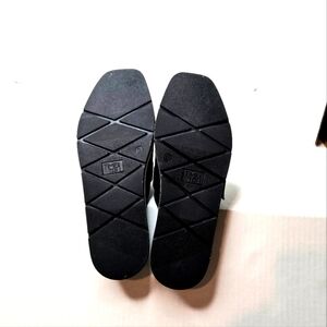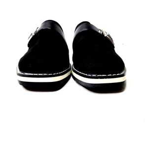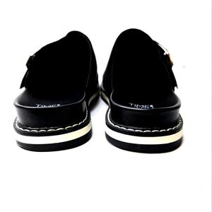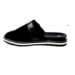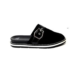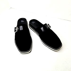 Time and Tru flat mules. Very sharp-looking shoes in a cool suede-looking black upper with a silver buckle accent, and white soles. Size 6M.