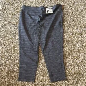 Comfortable knit leggings with subtle stripe texture. Stretchy waistband for easy wear. Cropped ankle length. Versatile everyday style.