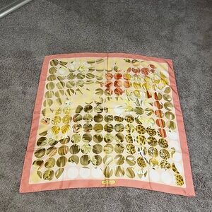 Elegant Salvatore Ferragamo silk scarf with a floral and geometric dot motif. Soft pink border frames a cream background with yellow and green floral accents. Lightweight and luxe feel. Versatile accessory for styling.