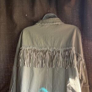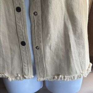 Fringe Trim Jean Jacket in Light Beige with fringe in front and back.