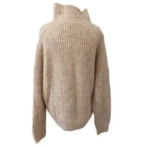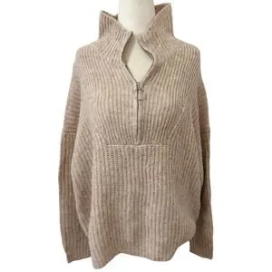 George quarter-zip sweater in an oatmeal heather with a chunky ribbed texture, ring-pull zipper, high neckline. relaxed, slightly oversized fit and dropped shoulders.