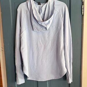 Light blue Skechers crewneck with attached hood. Soft fabric and relaxed silhouette. Front kangaroo pocket for storage. Long sleeves with a casual hem. Easy everyday layering piece.