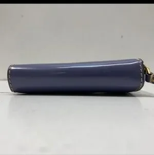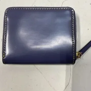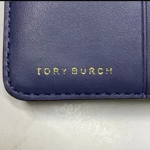 Compact navy zip wallet. Shiny leather finish. Gold Tory Burch logo on front. Zipper pull in matching Lotus ๐๐ Color