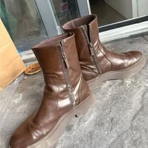 Zara men's ankle boots in smooth brown leather. Platform sole for added height. Slip-on style with inner zipper. Clean, simple silhouette. Versatile design for casual or dress looks.