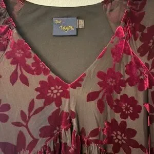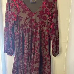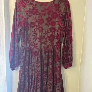 Rich burgundy floral velvet overlay. V-neck with tiered skirt. Long sleeves with elastic cuffs. Soft textured fabric for a dressy look. Really cute & flattering & so very comfy !