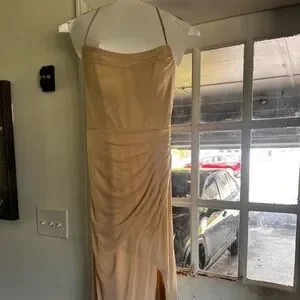 Azazie Spaghetti strap champagne dress with back detail. Worn twice. Size 10. Hemmed slightly. I am 5’4” and wore two inch heels and it was fine. Back detail and thigh slit. Dry cleaned after wearing.