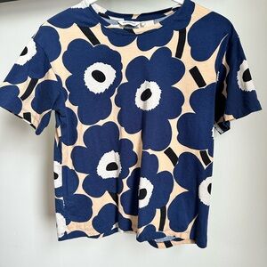 Marimekko short sleeve tee with bold floral Unikko print. Navy floral motifs on a cream ground. Simple, graphic style for casual wear. Very good used condition. Fits true to an XS