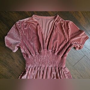 Elegant Ever Pretty pleated velvet dress in a soft rose gold tone. V-neck with flutter sleeves. Fitted smocked waist and flowing A-line skirt. Luxurious textured fabric with subtle sheen. Perfect for weddings or special events.