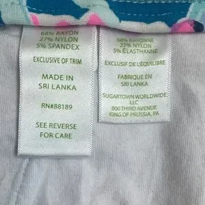 Vivid floral print in blue and pink. Scalloped hem adds feminine detail. Elastic back waist for comfort. Decorative gold-tone front button. Lightweight, breezy fabric for warm days. Very stretchy material.