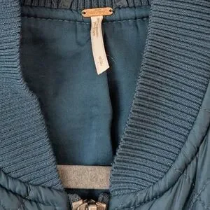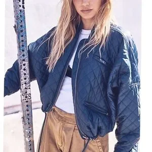 Nylon bomber featuring a quilted design with exposed outer pocket details and a drawstring band for added shape.