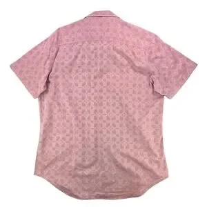 Features: Collar, button up, short sleeves, contrasting fabric pattern inside arm holes that are revealed when flipped up, script and RG initials at the bottom button of shirt,