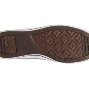 Converse high top sneaker with floral print. Pink canvas background with blue flowers. White laces and rubber sole. Classic Converse All Star ankle patch.