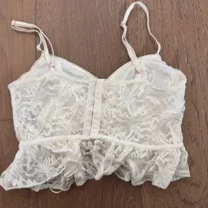 Chic lace bralette top with delicate straps. Soft cream hue. lined cups, lace up front, hook eye closure in back. lace corset crop top