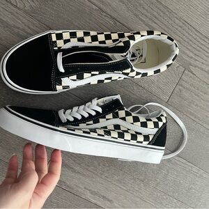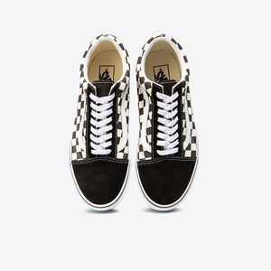 Iconic Vans Old Skool with black and white checkerboard panels. White laces and signature side stripe. Classic skate silhouette.