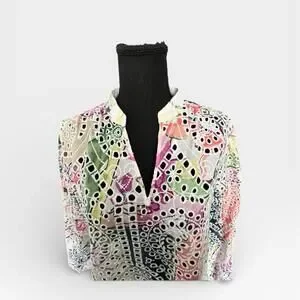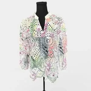 Beautiful Chico’s embroidered eyelet tunic in a soft, colorful abstract floral pattern. Lightweight 100% cotton with intricate cut-out embroidery throughout for an elevated boho look. Features a split V-neck, long sleeves, and an easy, relaxed silhouette—perfect for spring, summer, travel, or resort wear.