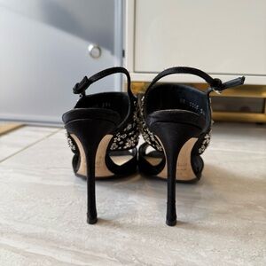 Elegant black slingback sandals with a high stiletto heel. Decorative crystal and rhinestone floral embellishments add sparkle to the upper. Cushioned insole for added comfort. Secure adjustable ankle strap for a refined fit. Perfect for evening wear and special occasions.