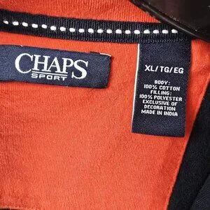 Chaps men’s pullover, navy blue top, casual activewear, XL men’s sweatshirt, sport style clothing, Chaps Sport logo, navy red activewear, men’s ribbed hem, quarter zip sweatshirt, red contrast interior, cotton blend pullover, embroidered detail top, cotton polyester sweatshirt