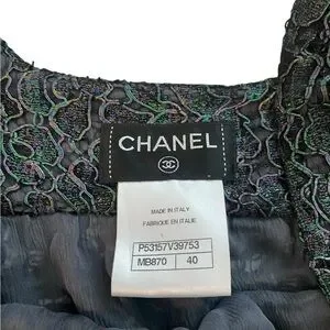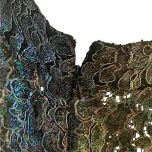 Elevate your look with this stunning authentic Chanel black lace top, crafted from intricate metallic iridescent lace that shimmers in tones of green, violet, and blue. A perfect blend of classic Chanel sophistication and modern edge.