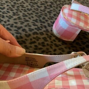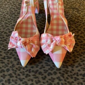 Pink gingham slingback flats with a bow accent at the toe. Pointed-toe silhouette for a feminine finish. Slingback strap for easy wear.