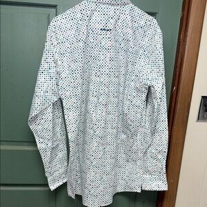 Lightweight white long-sleeve button-down with a small multicolor dot pattern. Point collar and classic button front. Subtle Ariat branding at the chest. Versatile for casual or smart-casual wear.