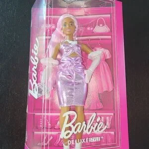 Barbie wears a shiny metallic pink cocktail dress. She has long white gloves and a matching white headband. Styled with a pearl necklace and white boots. Perfect for display or play.