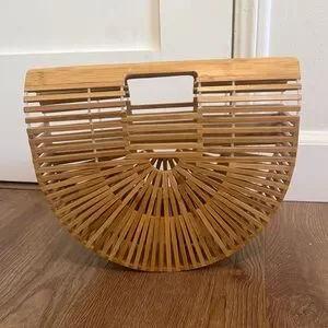 Structured bamboo clutch in a half-moon silhouette. Open slatted design with top handle. Lightweight and airy. Perfect for warm-weather looks.