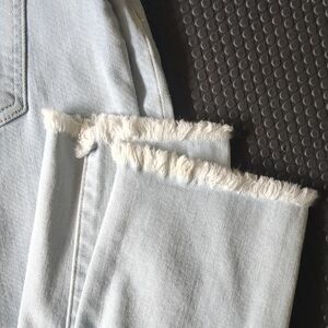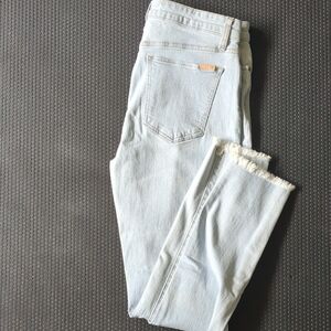 Light blue wash women's ankle jeans with frayed cropped hems. High rise skinny silhouette with classic five-pocket styling. Soft denim with subtle fading for a lived-in look. Easy pairing for casual outfits. Only worn twice.