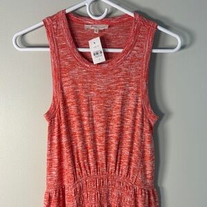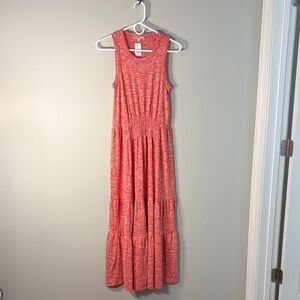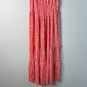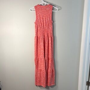 Lou & Grey sleeveless coral melange maxi dress with a smocked waist and tiered skirt. Soft knit fabric for breathable, all-day comfort. Effortless casual style that transitions easily from day to evening.