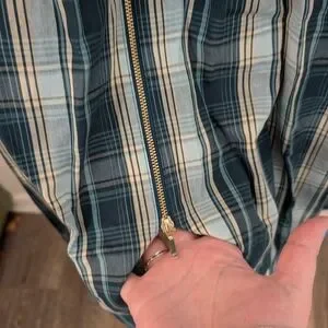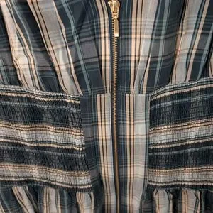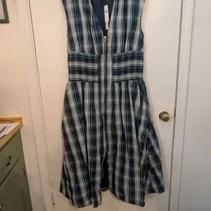 Sleeveless midi with teal and white plaid. Deep V-neck and front zip closure. Smocked waist defines the silhouette. Full skirt with side pockets for easy wear.