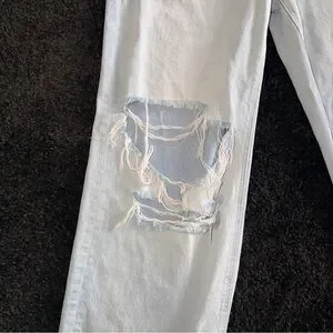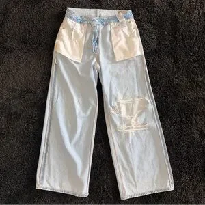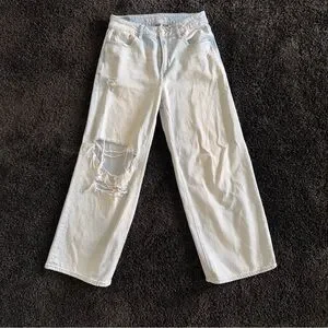 High-rise wide leg jeans with a relaxed fit. Light blue denim features a large distressed rip on one knee. Simple five-pocket styling and clean hems. Casual, on-trend look that pairs with sneakers or sandals.