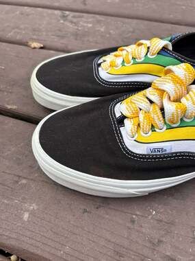 Condition: Good pre-owned condition. Shows some minor light staining/fading on the black toe box canvas and minimal wear on the outsoles. Interior branding is crisp and intact.
