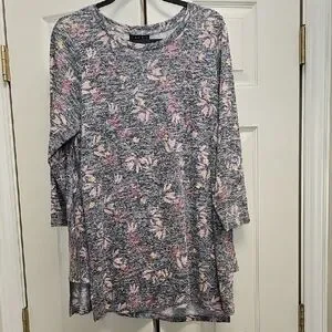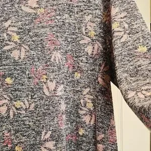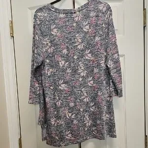 Lightweight long-sleeve tunic with a soft heathered gray base. All-over floral print in pink and subtle yellow highlights. Relaxed, easy-to-wear silhouette for casual layering. Soft knit fabric for everyday comfort.