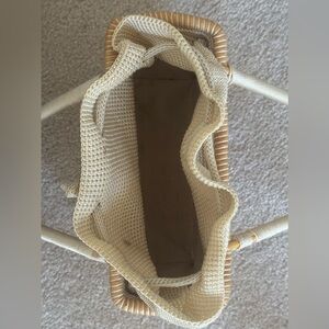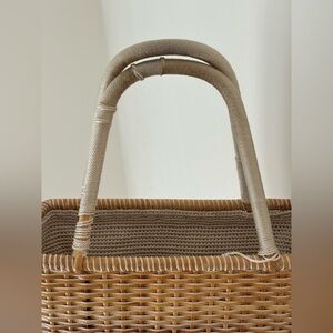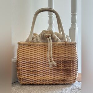A timeless woven basket bag in warm natural tones, featuring a structured wicker body and soft knit drawstring interior. Effortless and refined, perfect for summer styling, market days, or travel.