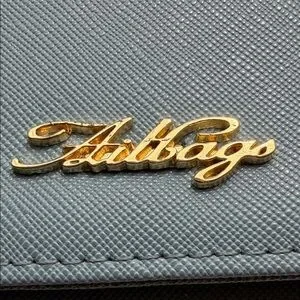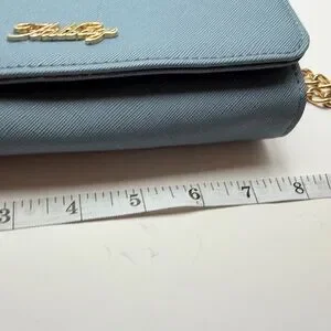 Elegant light blue crossbody crafted in textured saffiano-style leather. Features a gold-tone chain and adjustable strap for versatile wear. Sleek flap with subtle gold logo accent adds refined detail. Perfect for carrying essentials with a polished look.