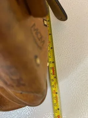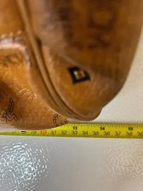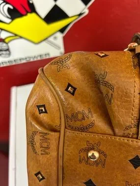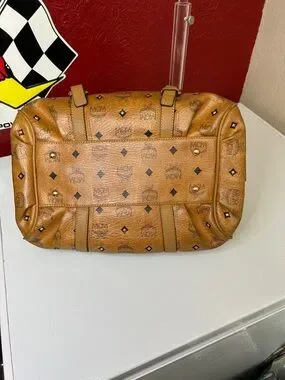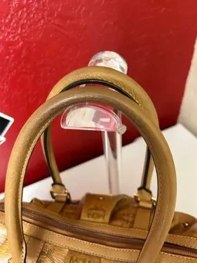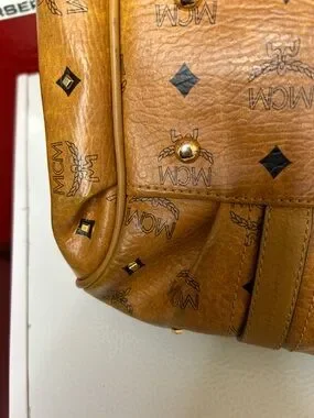 Classic MCM Visetos satchel in cognac leather. Barrel silhouette with dual rolled top handles. Signature repeat logo print across the body. Gold-tone logo plaque and hardware accents. Structured yet soft shape for everyday use.